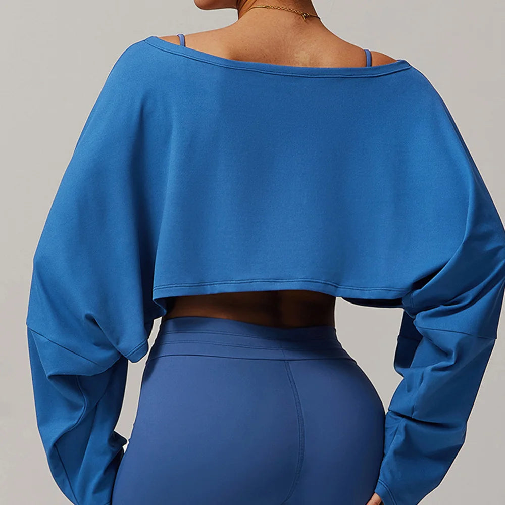 עיצוב כתף אחת אלגנטי עם שרוול Batwing רחב וגזרה רפויה יוצר מראה סקסי־עדין, זורם ונוח – מושלם ליוגה, לאימון קל וללוק קז’ואל יומיומי.