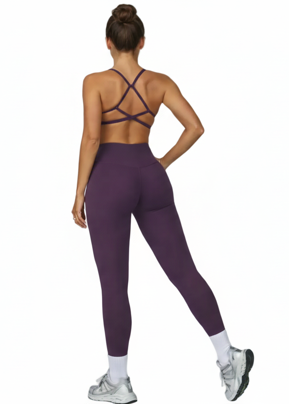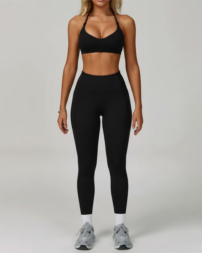 סט שני חלקים הכולל טופ ספורט תומך וטלגינג בגזרה גבוהה, מעוצב להדגשת קווי הגוף ולחוויית אימון יציבה ובטוחה.