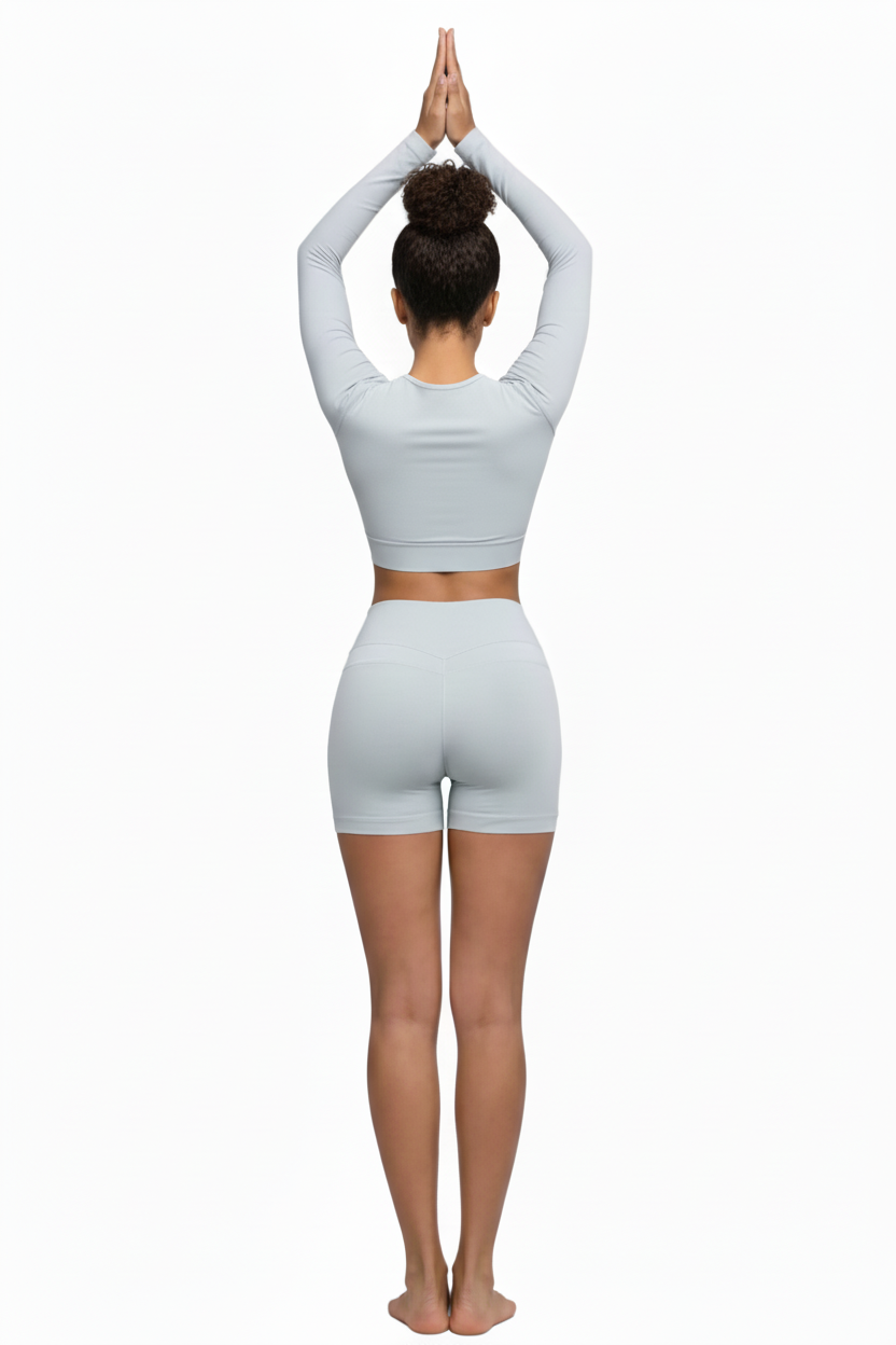 סט ספורטיבי לנשים בעיצוב עוצמתי ומדויק, המשלב טופ קרופ עם שרוולים ארוכים וחיתוך קדמי טרנדי, יחד עם שורט מחטב בגזרת High Waist. סט שמייצר איזון מושלם בין נוחות, תמיכה וסטייל – לאימון וללוק ספורט־אופנתי בולט.